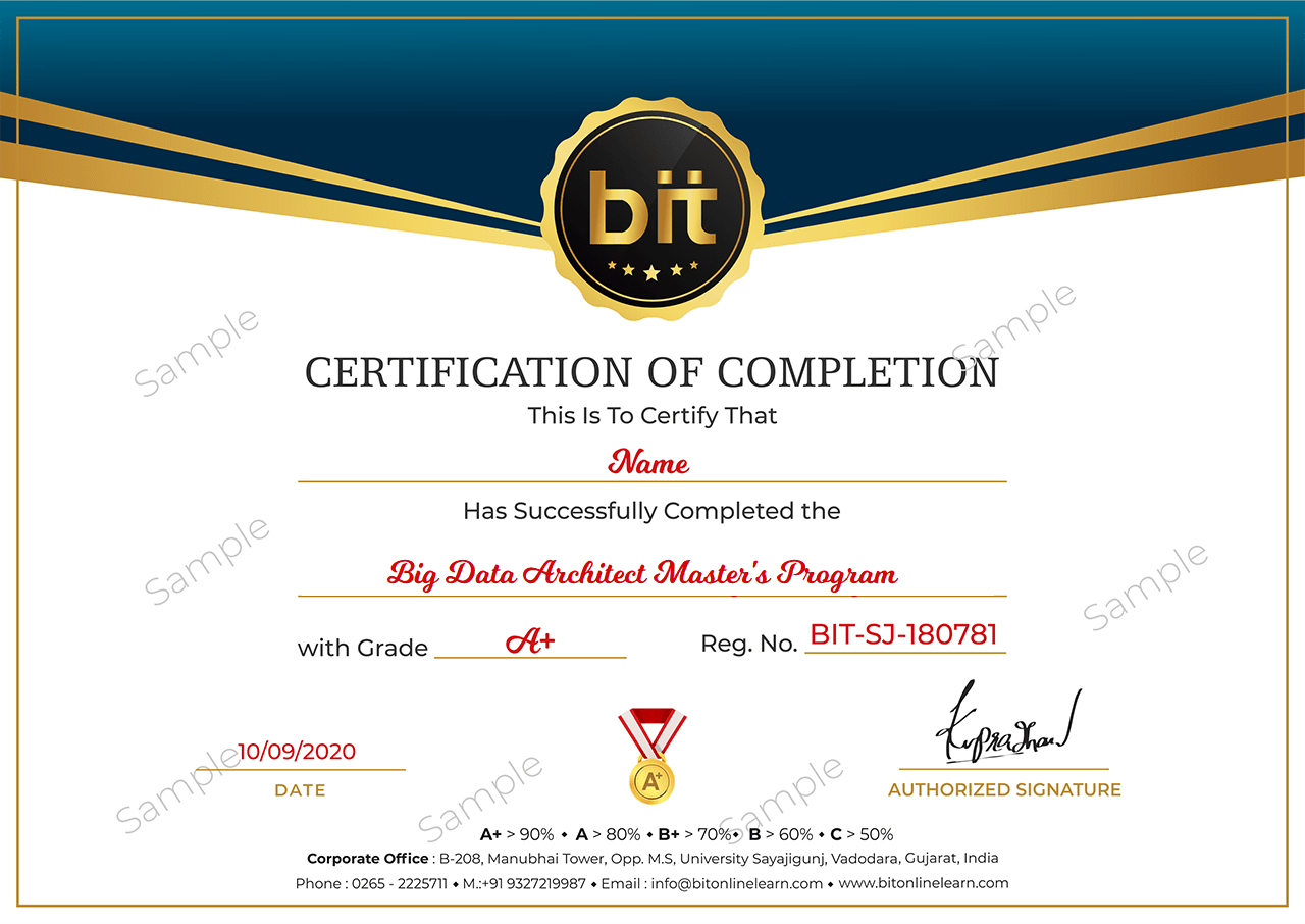 BIT's extensive Big Data Hadoop Architect online training is curated by Hadoop experts, and it covers in-depth knowledge on Big Data and Hadoop Ecosystem tools such as Spark, Scala, Splunk, Storm, Kafka and Cassandra. Masters Program is a structured learning path recommended by leading industry experts and ensures that you transform into an expert Big Data Architect. Being a Big Data Architect requires you to be a master of multitude skills, and this program aims at providing you an in-depth knowledge of the entire Big Data Ecosystem.